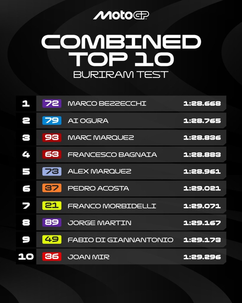 Questi test cosa ci dicono!? Praticamente Marc Marquez, nonostante il virus intestinale e la scarsa preparazione fisica (dovuta allo stop forzato dopo l’operazione), ha fatto capire a tutti che è il Pilota da battere anche nel 2026. Sarà un remake del 2025, sempre che qualcuno non lo prenda nuovamente in pieno nella carena, sia chiaro… Per la Thailandia ha il potenziale per vincere, ma ho dei dubbi sulla tenuta nella gara lunga. Dovesse vincere domenica prossima sarebbe un impresa incredibile.