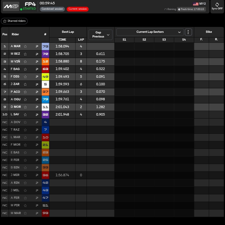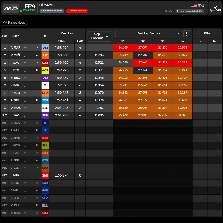🔴 04.00 Il record della pista di Sepang risalente al 2023 verrà frantumato quest’oggi e non mi sorprenderebbe vedere qualcuno girare sul 1.55 a Sepang. Prima ora di test in cui la Ducati è padrona incontrastata con 4 moto nelle prime 5. Solamente Bezzecchi prova a contrastarle.