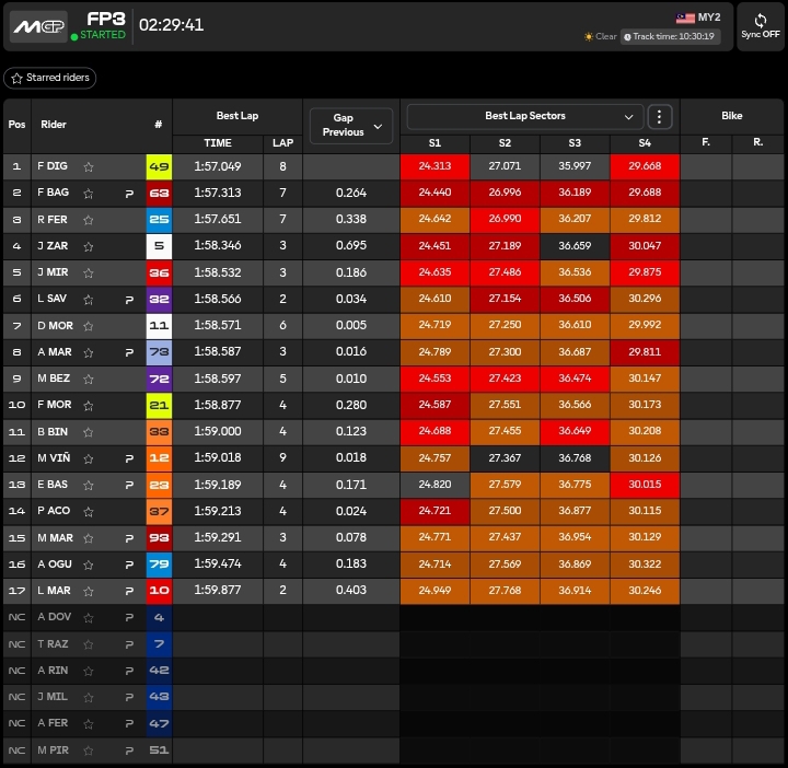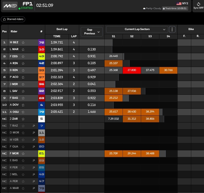 🔴Marco Bezzecchi con 1.57.894 sigla il miglior tempo a Sepang e nel giro successivo, mentre stava abbassando ulteriormente ha un problema tecnico alla moto ed è costretto a fermarsi a bordo pista.