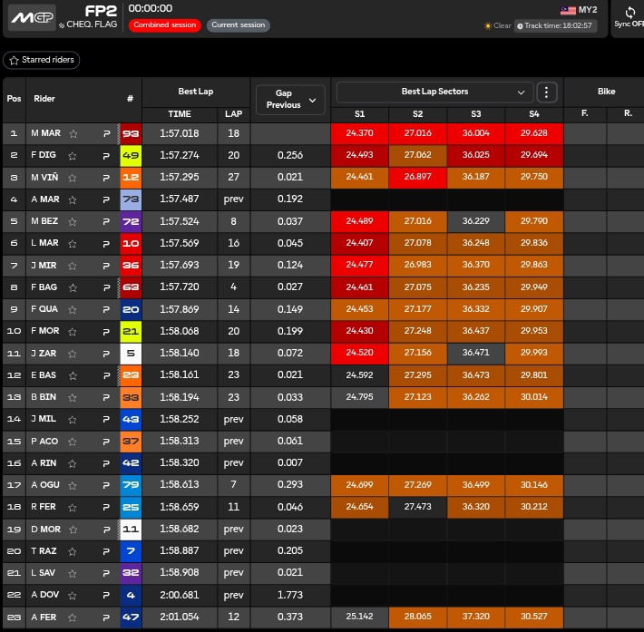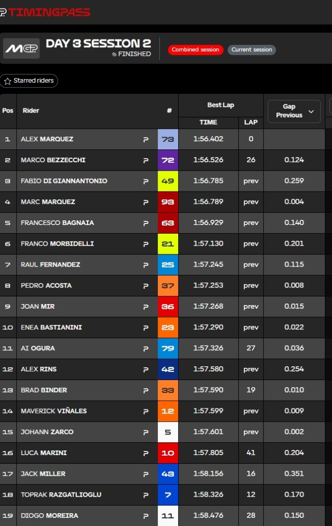 🏁 BANDIERA A SCACCHI. Marc Marquez è il migliore in pista con un tempo vicinissimo alla pole (18 millesimi) del 2025 di Bagnaia, chiudendo in 1.57.018. segue Di Giannantonio in 1.57.274 ed un grande Maverick Vinales in 1.57.295, addirittura un decimo meglio rispetto al tempo in qualifica di Acosta nel 2025. Poi Alex Marquez in 1.57.487 e Marco Bezzecchi in 1.57.524 a chiudere la TOP5. Seguono le Honda HRC di Marini e Mir, poi Bagnaia in 8^ posizione a 7 decimi da Marc, infine a chiudere la TOP10 sono Quartararo (miglior Yamaha in 1.57.869) e Morbidelli (1.58.068) che è la peggior Ducati in pista. Tutte le Ducati in Top10. Pedro Acosta oggi lontano da Vinales, chiude in 15^ posizione in 1.58.313 mentre i rookie Moreira (1.58.682) e Razgatioglu (1.58.887) chiudono rispettivamente 19° e 20°. Si ritorna alle 03.00 di stanotte.