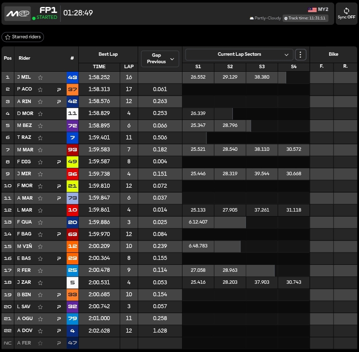🔴 TEMPI ALLE 11.30 (04.30 ITALIANE) Jack Miller in testa con 1.58.252, davanti a Pedro Acosta in 1.58.313.