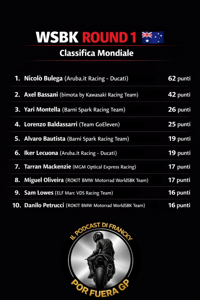 Ducati ha dimostrato di essere la moto da battere in questo 2026, monopolizzando il podio in gara 1, con Montella e Baldassarri (rookie) arrivati alle spalle di Bulega. In gara 2 anche Alvaro Bautista sale sul podio, diventando dopo Max Biaggi il più “anziano” a farlo. Per Alvaro un weekend in chiaro scuro in cui ha trovato la luce grazie alla pioggia della Domenica ed all’esperienza nel gestire la corsa, cosa che è mancata al compagno di Team Yari Montella che comunque è stato tutto il weekend davanti al veterano spagnolo.