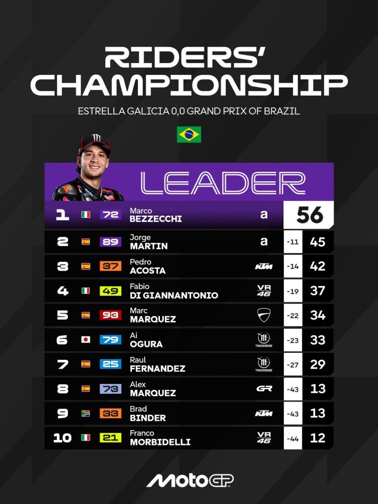 La sprint ci aveva regalato una bellissima battaglia tra le Ducati di Di Giannantonio e Marquez, con il 93 che vincendo la sprint in Brasile eguaglia il record di 16 vittorie di Jorge Martin nelle gare corte. Sembra quasi che la Ducati paghi, con questa carcassa, i primi giri di gara con serbatoio pieno, un po’ come accadeva qualche anno fa alla GP23 quando Michelin portò la famosa carcassa che invece sposava alla perfezione le caratteristiche della GP24.